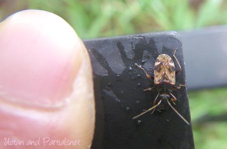 体長7mm前後、小型のカメムシです。最初カスミカメを疑って空振りし、次にハナカメを疑って再び空振り、危うく三振かというところでギリギリのポテンヒットとなりました。