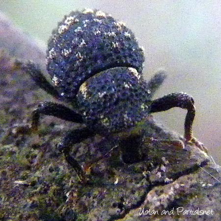 体長4mm前後の小さなゾウムシが古い竹材で一所懸命に穴を穿っている。黒いひょうたん型のボディには白い鱗片がまばらに散らばっている。