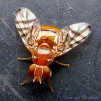 このハエを調べていた時、非常によく似たハエ(和名あり)をネットで見つけ、同定の参考にしようと和名を調べたものの図鑑では行き当たらず、ハエに詳しい「ヘキサポーダリサーチ」のサイトでお話を伺いました。