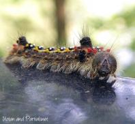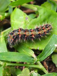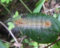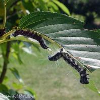 桜の木で大発生する毛虫(無毒)。体色は黒っぽく(赤黒~赤紫色)、毛は白色~黄色。若齢では赤色。サクラは丸坊主になっているものも多数見られた。