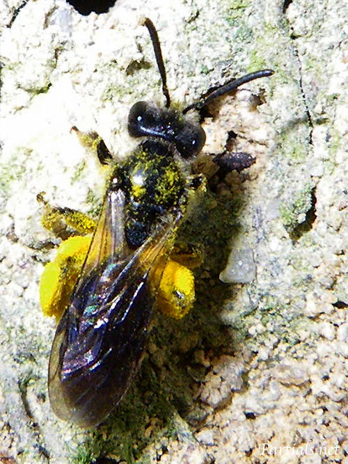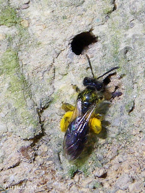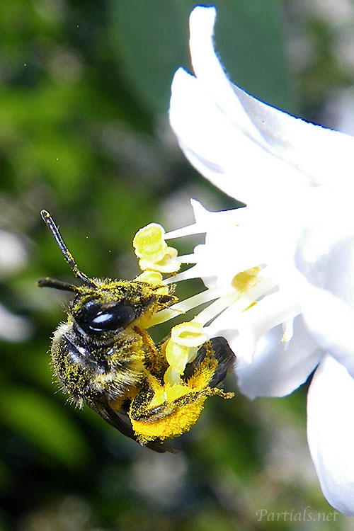 たくさんのこのハチがウツギの花に集まり、数メートルと離れていない巣のある場所と往復を繰り返しているところから、ウツギノヒメハナバチかと思った。ただ、このハチたちの巣穴はすべて、切り立った土崖に掘られていて、そういう場所に「ウツギノ、、」の巣がある例を聞いたことがないため、ヒメハナバチ科の一種としておきます。