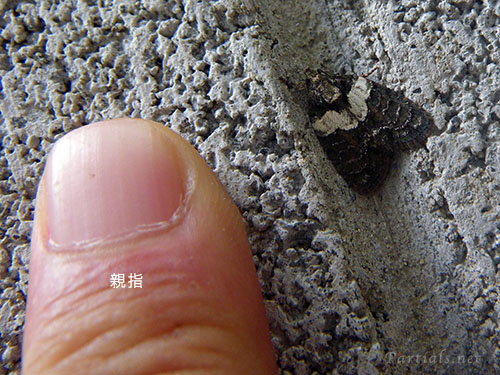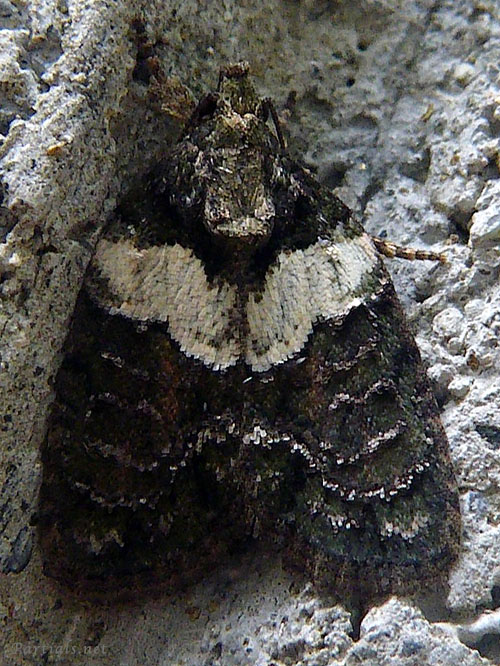 黒っぽい三角形の蛾。この名前だが地衣類を食べるという。色調は個体差が大きい。この個体は太い変形V字の白帯がクッキリしていて翅のベース色はこげ茶に深緑色が混じっている。下唇髭は太短く立ち上がっている