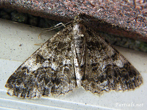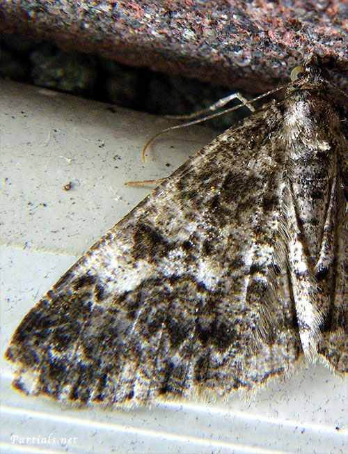 三角形に止まる、木肌のような曖昧な色模様の蛾。翅の中程に白っぽい太い筋が横に走る。