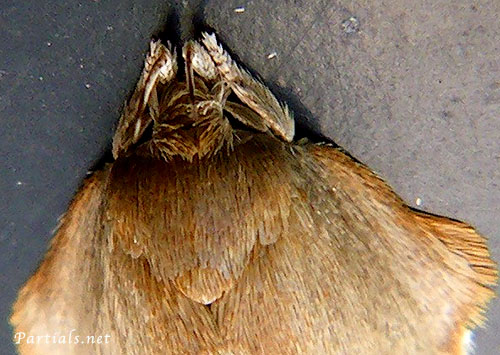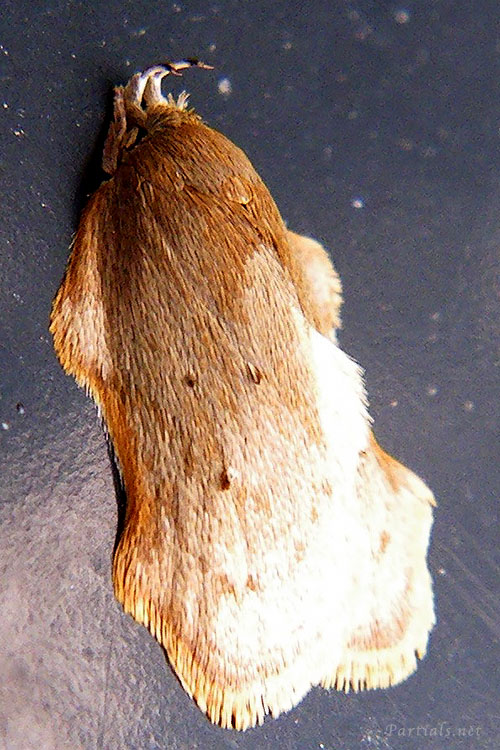 全体に茶色く、翅の左右縁に2箇所づつ出っ張りがある小型の蛾。下唇髭は反り返って立ち上がる。形で見ると一部のハマキガ科によく似ていたためハマキガ周辺で調べていたら迷宮にはまって1年ほど種が決定できなかった。
