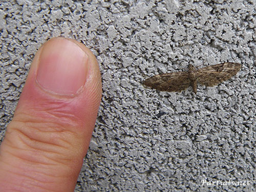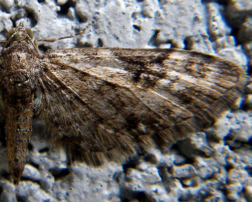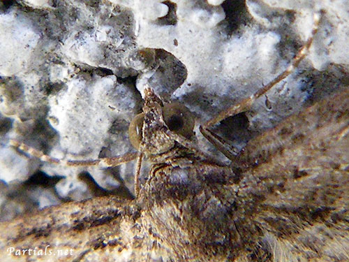 木肌色模様で横に細長い小型の蛾。模様も曖昧で近似種も多い事から、間違いの可能性あり。
