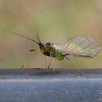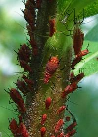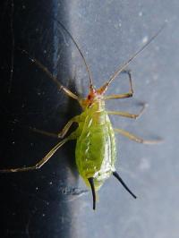 緑色の体色に黒の斑がある。頭部は黒く目は赤い。