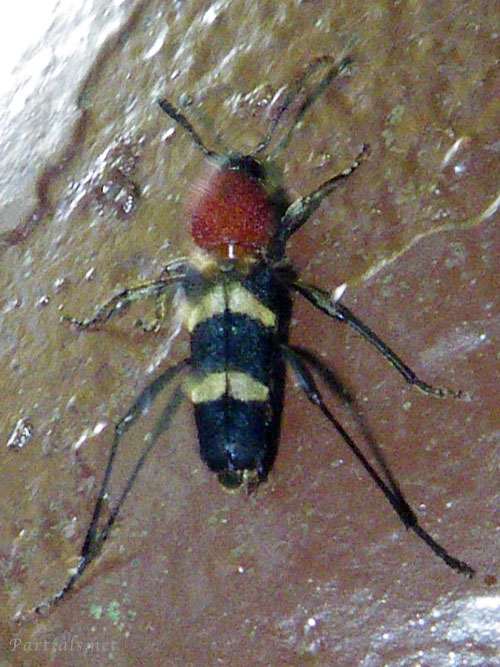 体長1cm前後、ほぼ同じ色柄の酷似種(クビアカトラ)がいるが、肩付近の白斑形状の違いで見分け可能