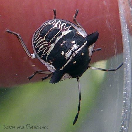 主として草食性、たまに肉食もするという雑食性カメムシ。両肩に張り出した角が水牛のよう。